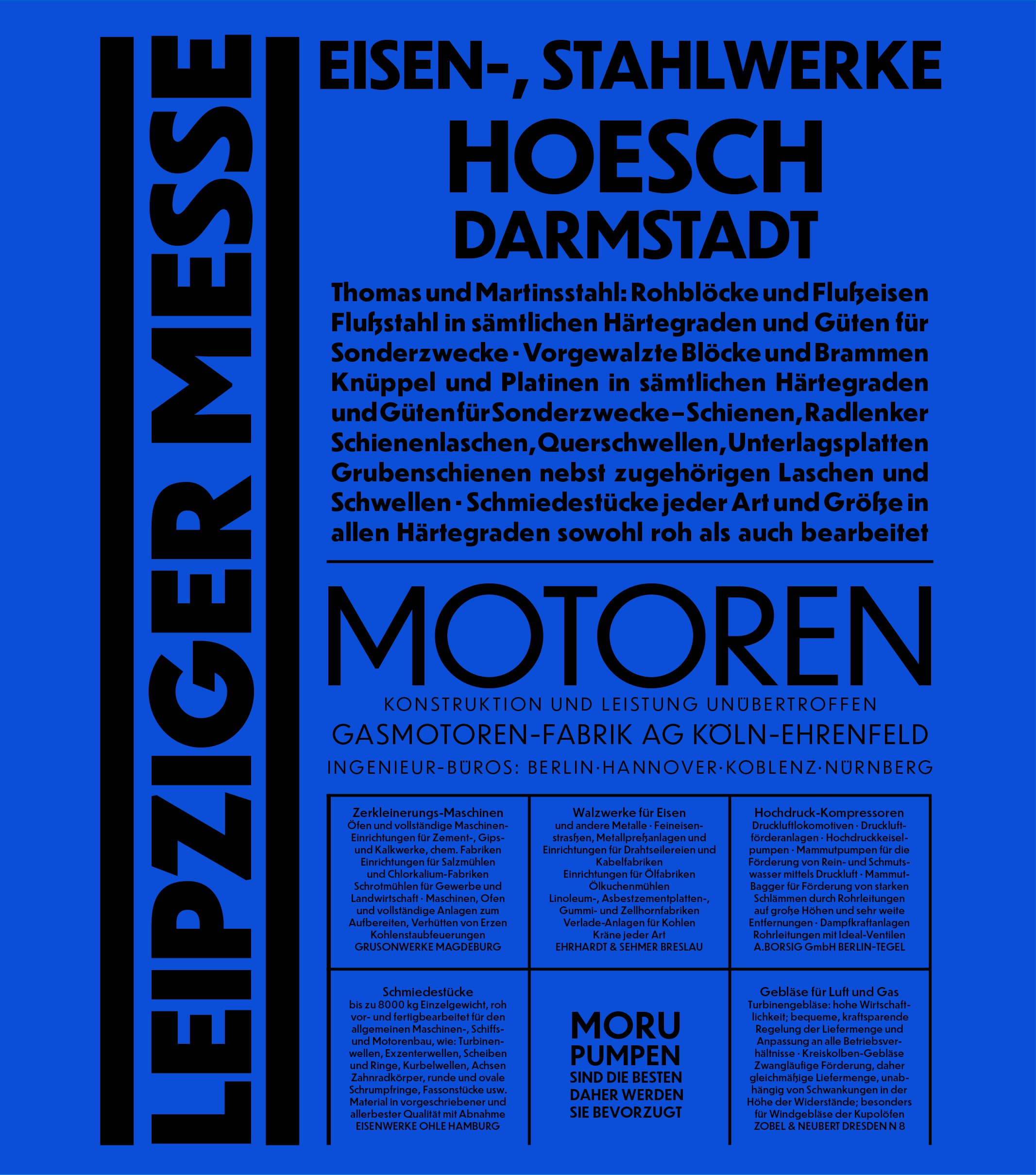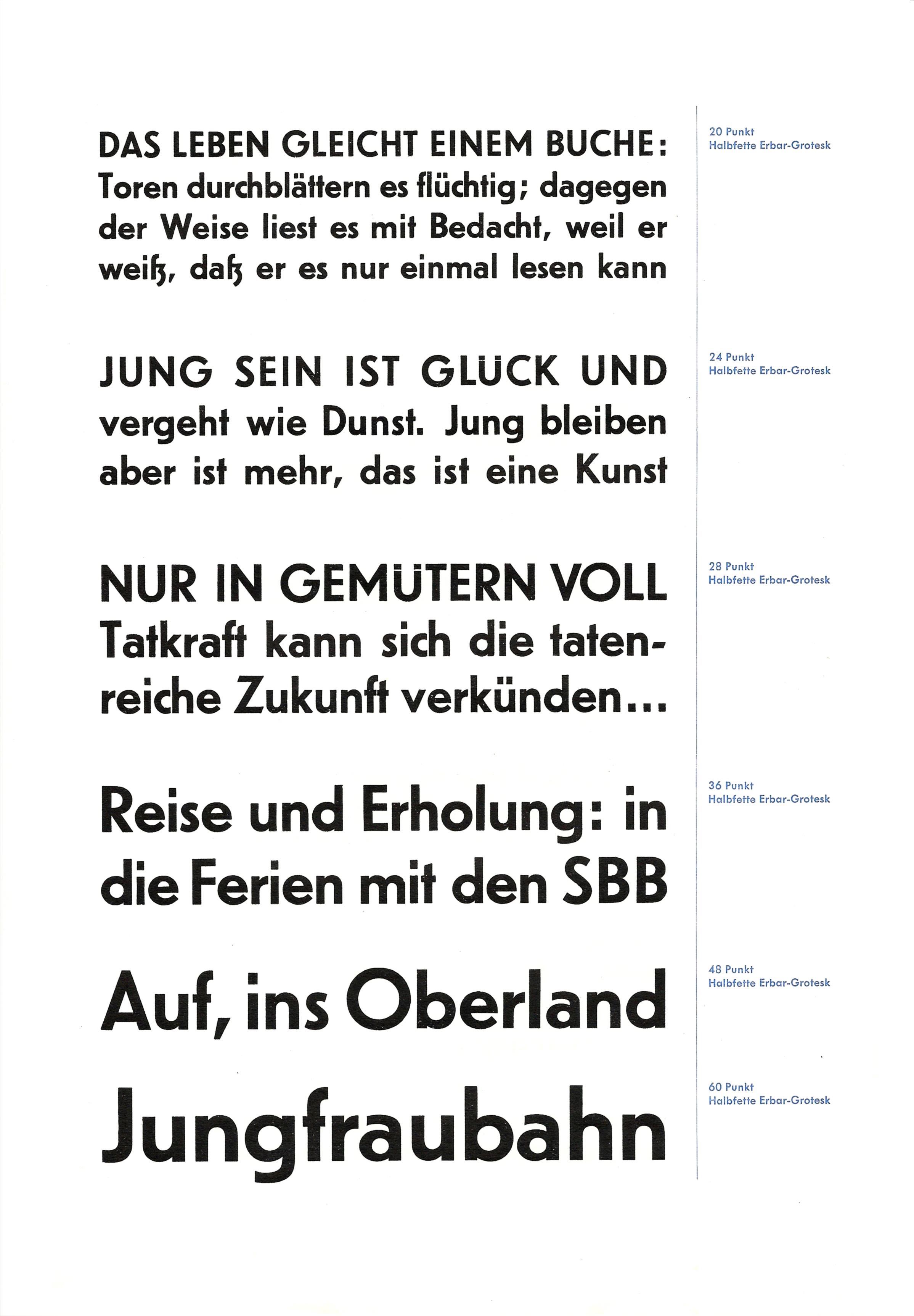Born 1878 in Düsseldorf, Jakob Erbar trained as a typesetter and worked as an educator at the Düsseldorf school of printing, and later as professor at the school of arts and crafts in Cologne. His first typeface was the innovative sans serif with stroke contrast Feder-Grotesk in 1909 — back then the first typeface in this style, which was later popularized by Lydian and has recently seen a remarkable revival. A chancery blackletter (Erbar Kanzlei, 1913) and a serif family (Erbar Mediaeval, 1914) followed before Ludwig & Mayer published Erbar’s Lichte Fette Grotesk, a striking inline display face, in 1923.