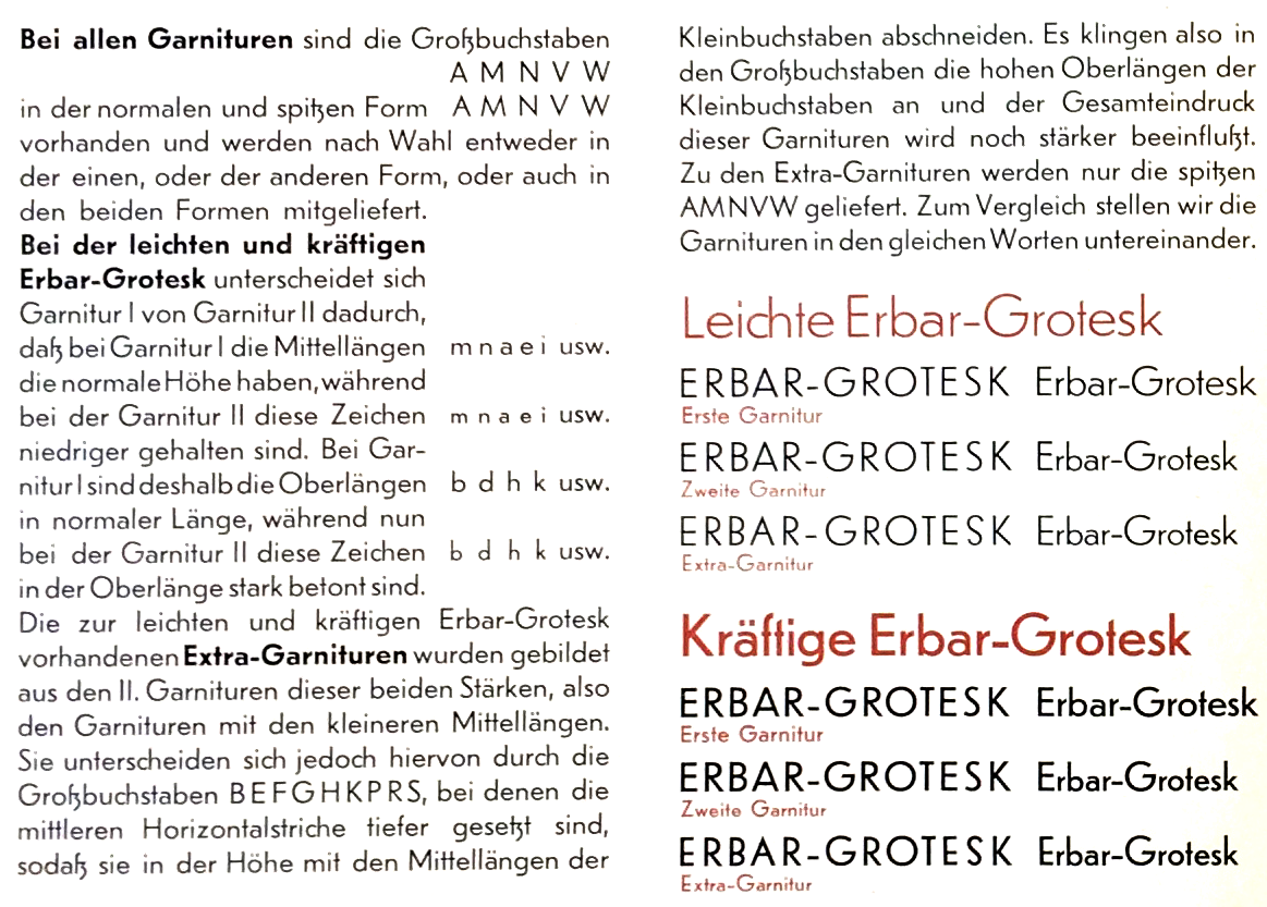 By 1930 — the heydays of geometric sans — the Erbar-Grotesk family was remarkably extensive, offering four weights, two of them in three different sets, italics and a condensed variant in two weights, plus the four separate display styles. In 1931, Erbar-Grotesk also became available for the Linotype system in sizes as small as 6 pt (4 pt for hand composition!). Many characters were available in alternate forms, for instance a single-story a, a spurless u, A M N V W with pointy apexes, a M with splayed stems, or a Y with horizontal base.