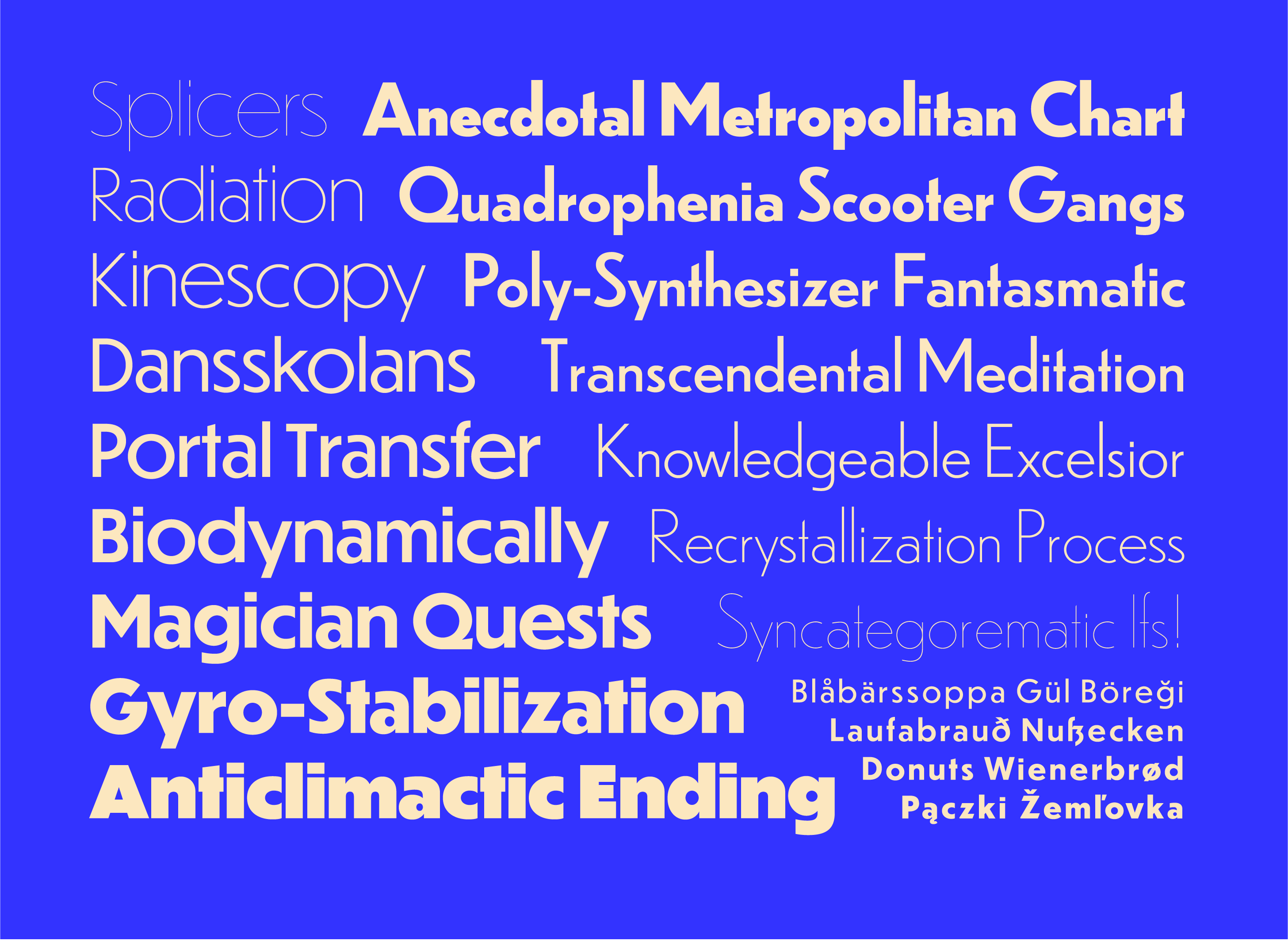 Dunbar is a type family for Akzidenzsatz — a jobbing face for display use and short texts, labels, banners, posters, packaging, etc. It can be retro in more than one way and contemporary in another. At least this is how I imagine it. I can’t wait to see how you use Dunbar.