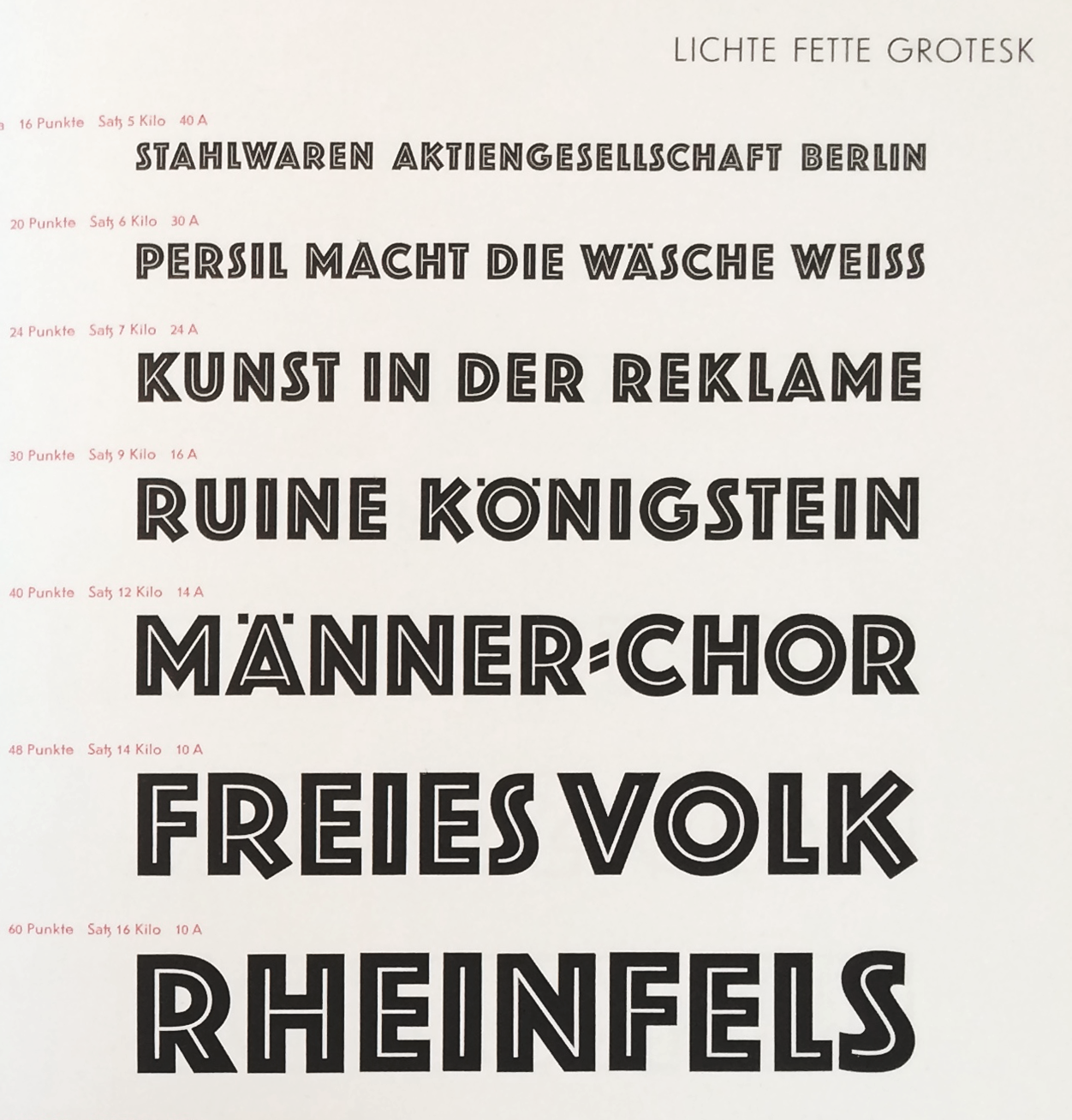 Another key design feature of Erbar-Grotesk is the distinct ß. You can still find it widely on Berlin street signs for which Erbar-Grotesk was the model, slightly differently adapted in former East and Western parts of Berlin. The classic roman proportions of the caps make Erbar-Grotesk also very well suited for use in all-caps setting. Jakob Erbar designed several all-caps display variants to go with his Grotesk family: the already mentioned Lichte Fette Grotesk (bold inline style, 1923) and Lucina (knocked-out white on black with border elements, 1926), Lumina (with heavy outline, 1928) and Lux (open inline thin-thick version, 1929)